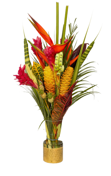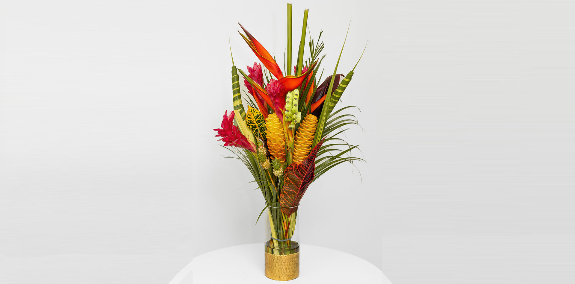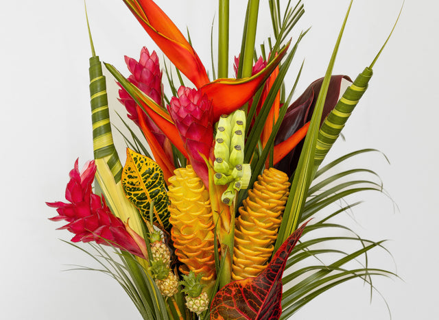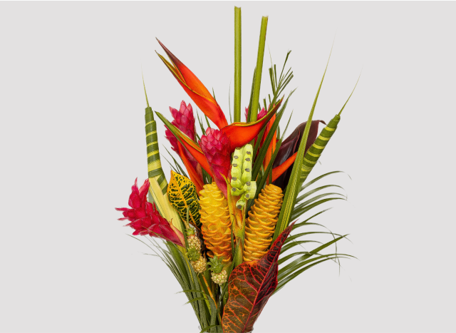Our curated 12 stem tropical arrangements are hand cut, boxed, and rushed to your door promising weeks of freshness.